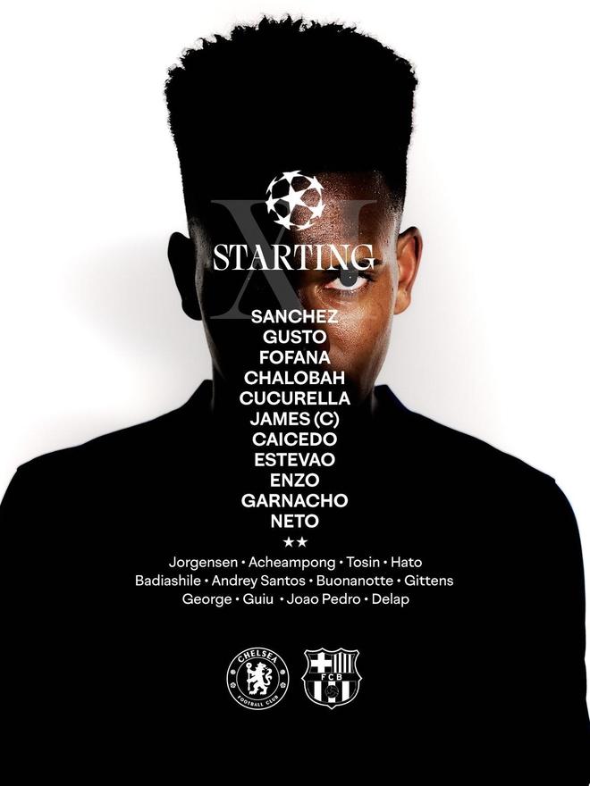 北京时间11月26日04:00,欧冠 联赛阶段 第5轮,切尔西主场迎战巴塞罗那,赛前双方球队首发名单公布如下: